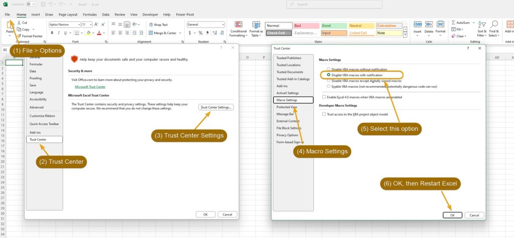 Sample Macro Settings: Below is an sample of configurations that allow Macro to run while you will still be notified when Excel workbook contains any macro.
