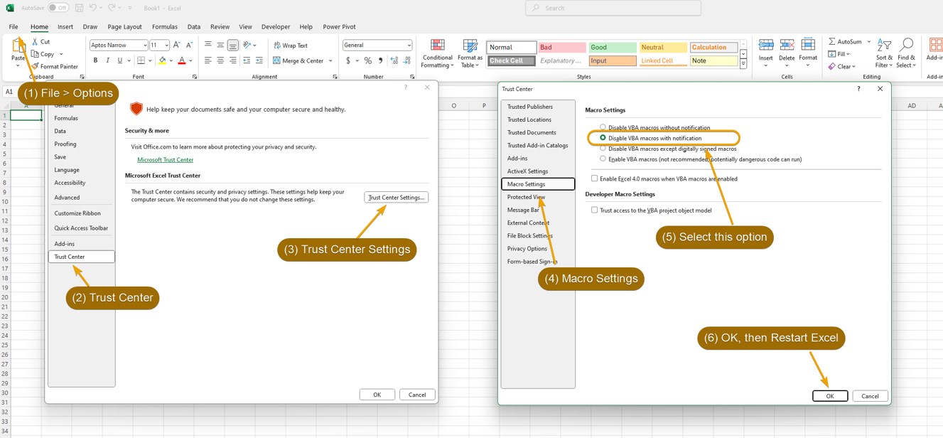 2. Please refer to this link to see how to enable macro for Excel workbook : https://support.microsoft.com/en-us/office/change-macro-security-settings-in-excel-a97c09d2-c082-46b8-b19f-e8621e8fe373