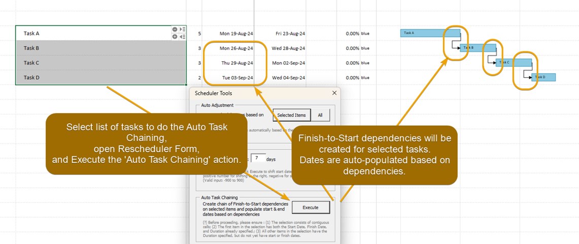 When you are building a list of dependent tasks (of Finish-to-Start type), you can use this feature to help create dependencies and populate dates in just a few clicks.